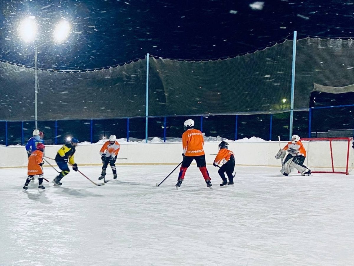 На льду встретились команды «Ветераны Егорьевского хоккея» и детская дворовая команда «Факел», под руководством инструктора по спорту Мельникова А.И.